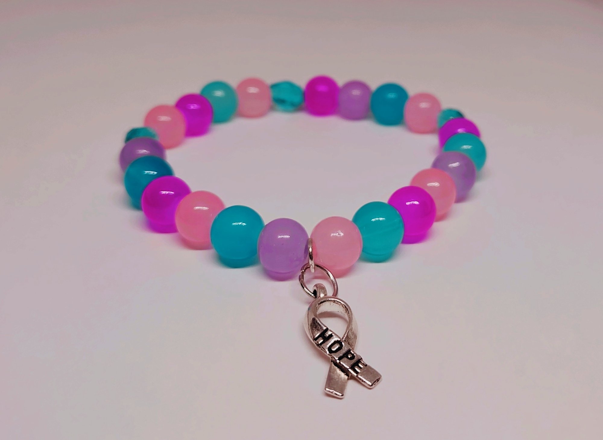 This stretchable bracelet is designed with 8mm glass beads in various vibrant shades, paired with aqua oval beads and a silver "hope" charm.