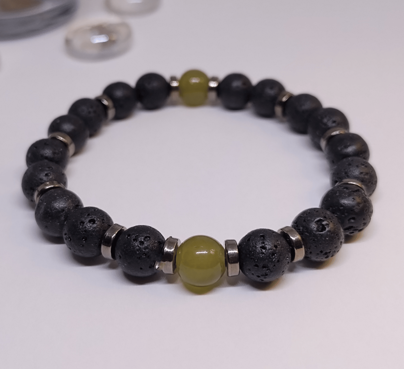 Lava Bracelet: Designed with 8mm natural black lava beads, paired with olive green glass beads, accented with graphite silver details.