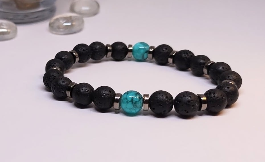 Lava Bracelet: Designed with 8mm natural lava beads, complemented by aqua swirl-pattern glass beads, and accented with graphite silver details.