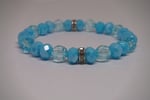 Crystal Bracelet: Designed with 8mm aquamarine blue faux crystal beads, diamond accents, and transparent aqua beads.