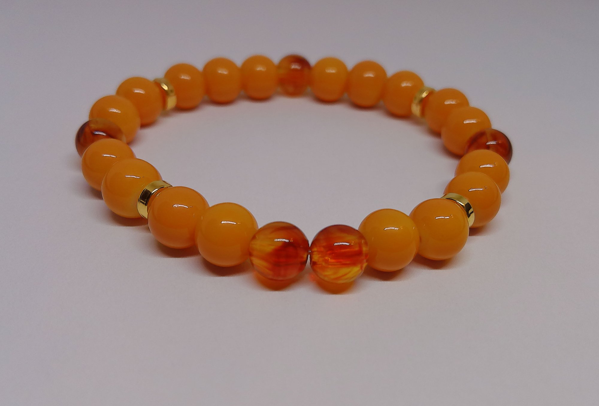 Embrace courage and strength with this stretchable bracelet, featuring 8mm orange glass and amber beads, complemented by golden accents.
