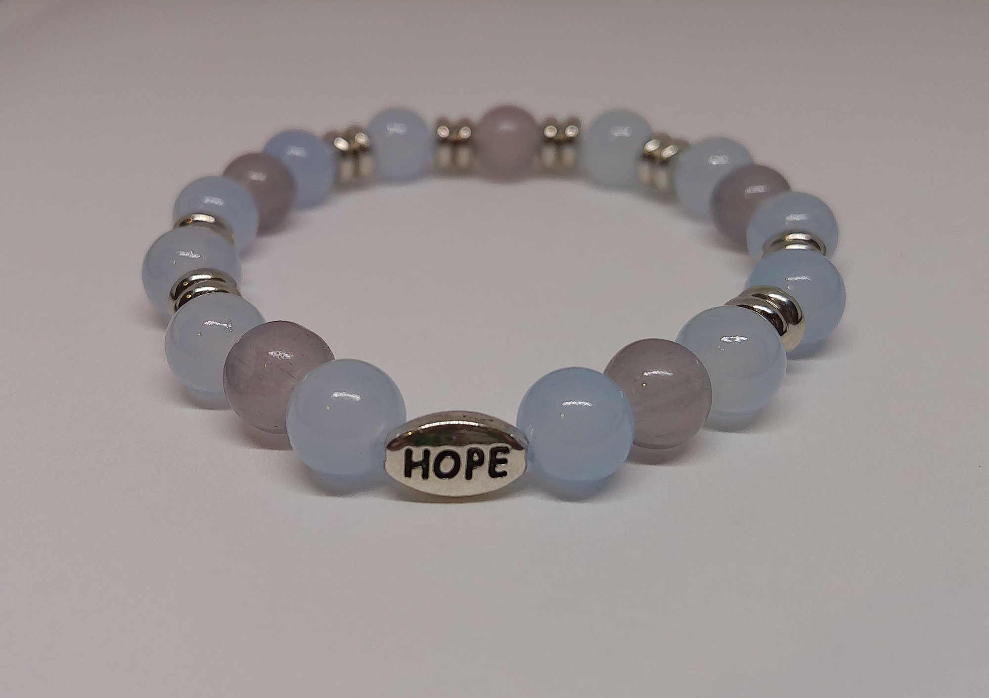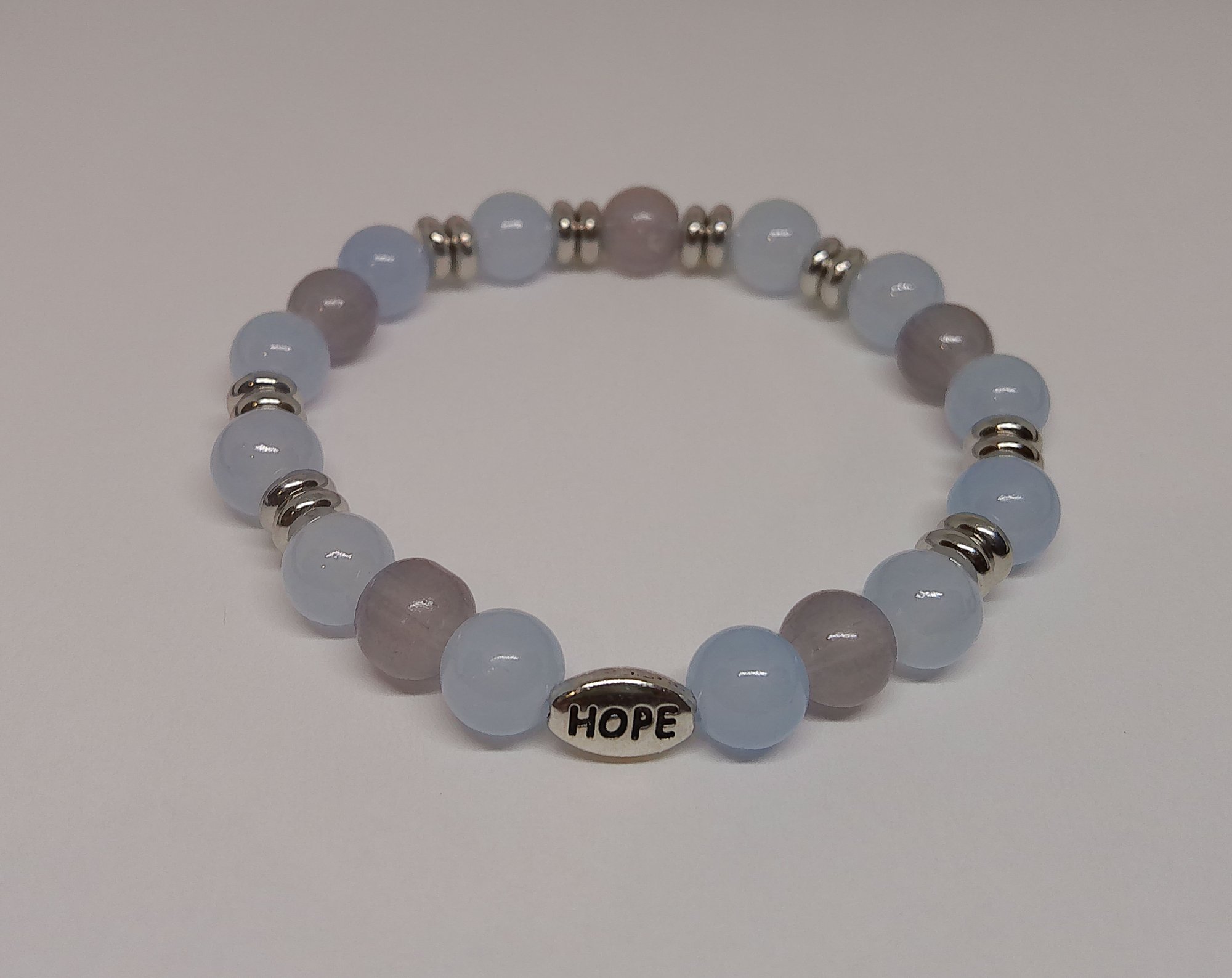 This stretchable bracelet is designed with 8mm glass beads of light blue and light gray, silver accents, and a silver "hope" charm.